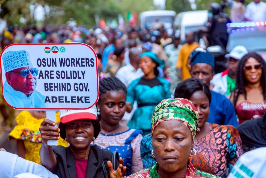 Osun public servants today trooped out in their thousands in what they called appreciation solidarity rally in support of Governor Ademola Adeleke for all his support and care for Osun workers since he took over state governance in 2022.