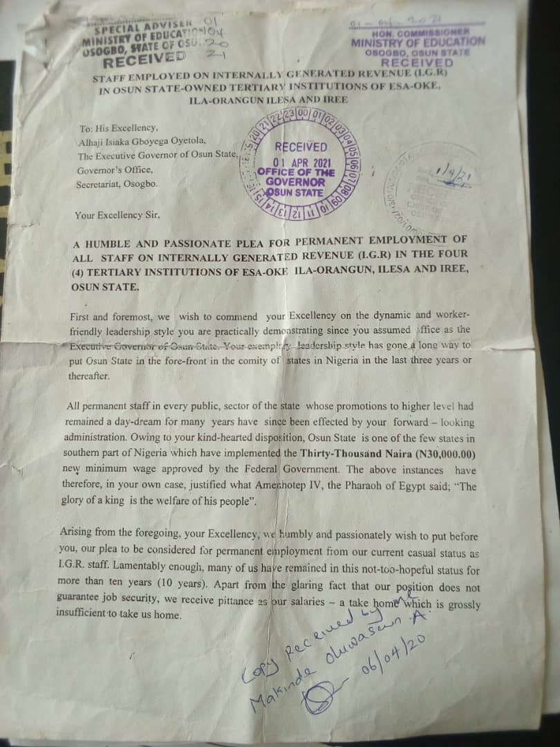 The casual staff in the four tertiary institutions owned by Osun State government otherwise known as Internally Generated Revenue (IGR) staff have appealed to Governor Gboyega Oyetola to consider them for permanent job.